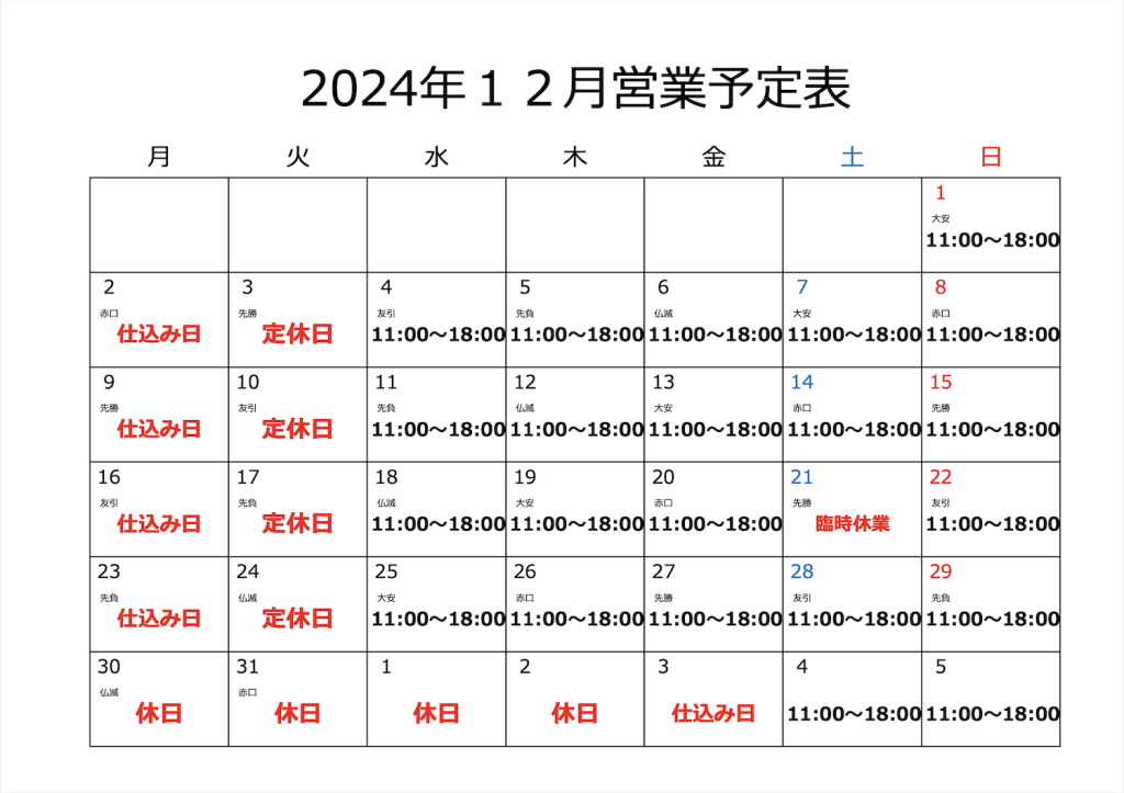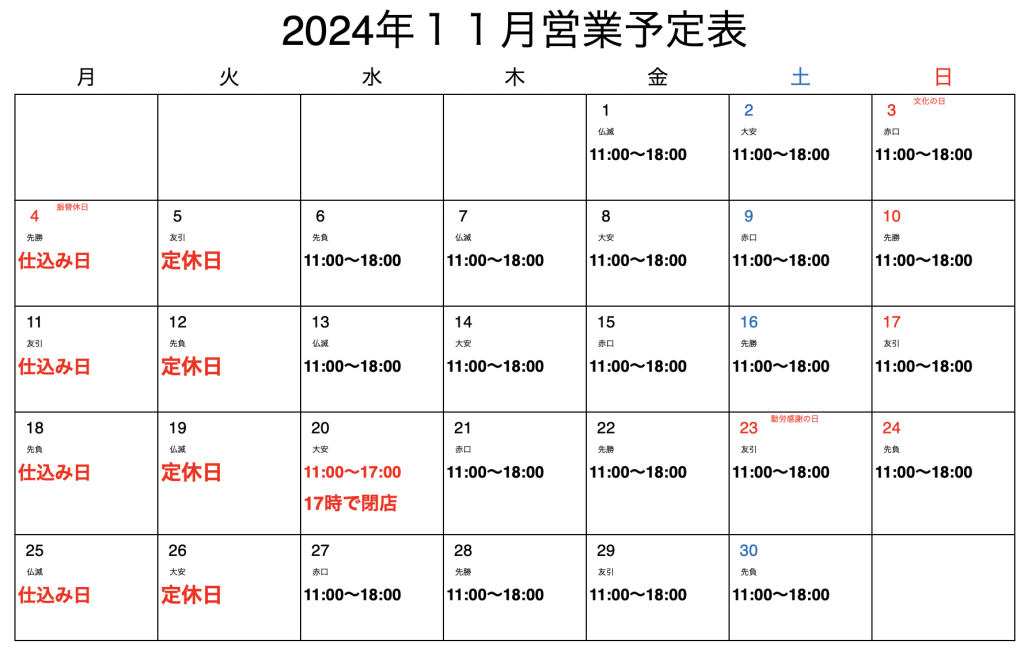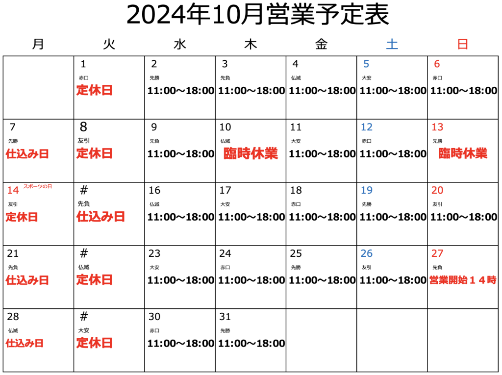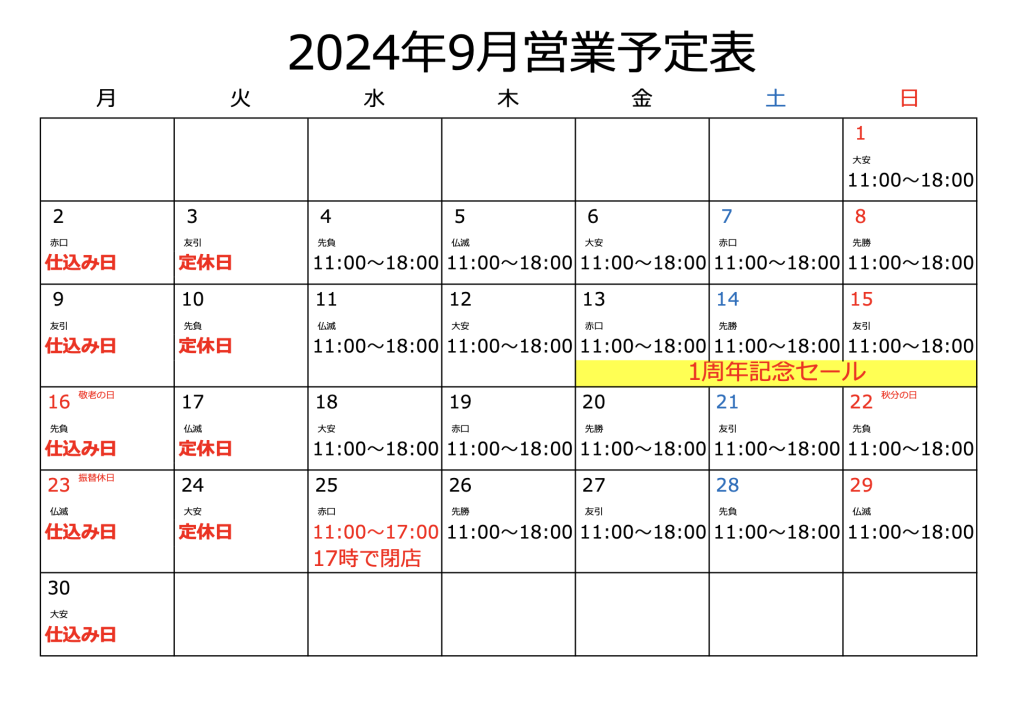 2024年9月営業予定表 9月の営業予定ですが、9月25日(水)17時閉店以外 は通常通り営業させて頂きます。 皆様のお越しをお待ち申し上げております。 [住所]東京都品川区二葉1-19-1アンシャンテ大井101号室 [